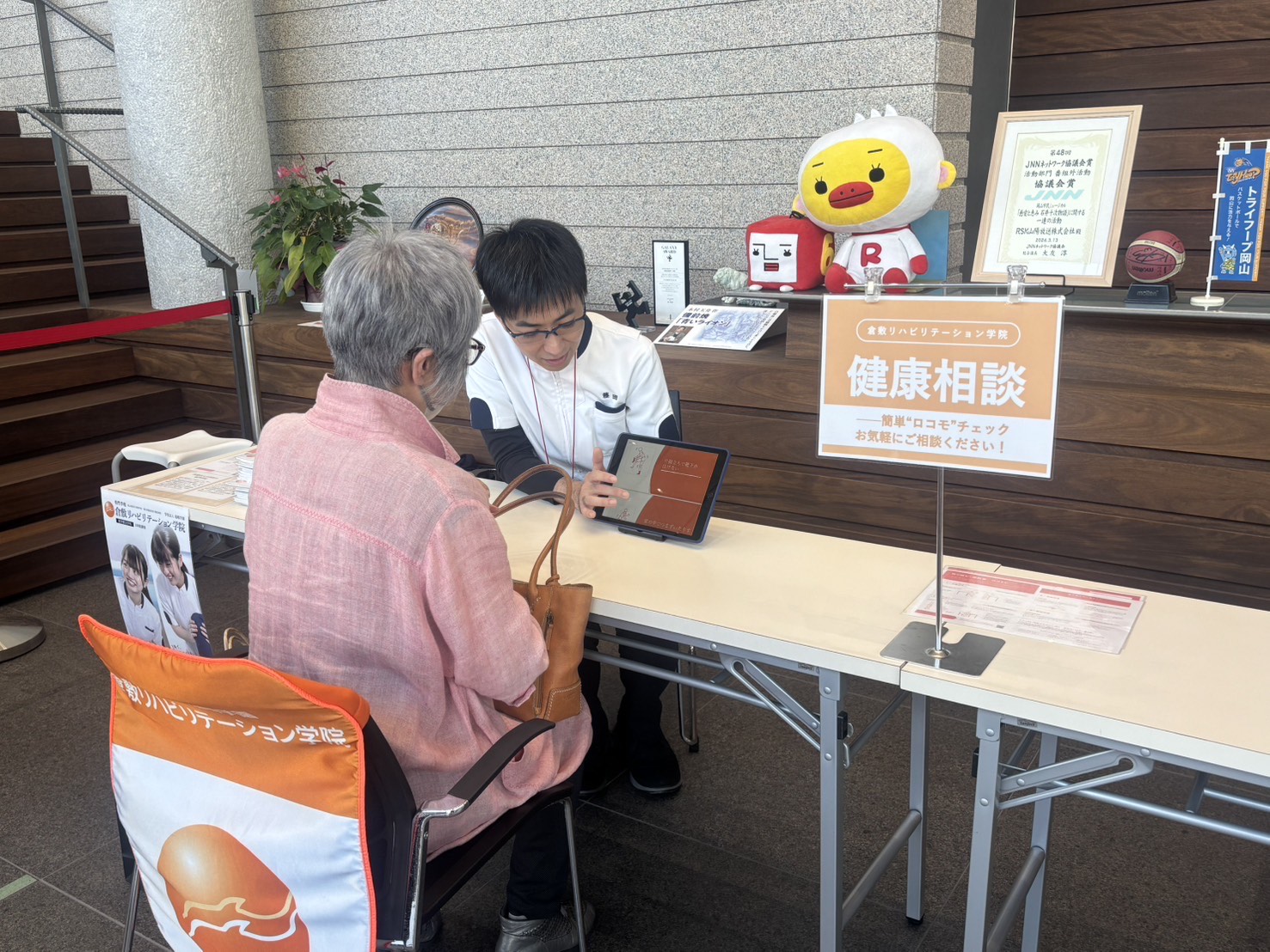 当日は、本学院の理学療法学科教員が、「2ステップテスト」と「立ち上がりテスト」を用いた簡単ロコモチェックを実施しました。これらのテストでは、下肢筋力や歩行能力を簡単に確認することができ、ロコモティブシンドローム(運動器の衰え)予防の一助となります。ブースでは多くの方にご参加いただき、測定結果の説明や今後の運動のアドバイスなどを行いました。