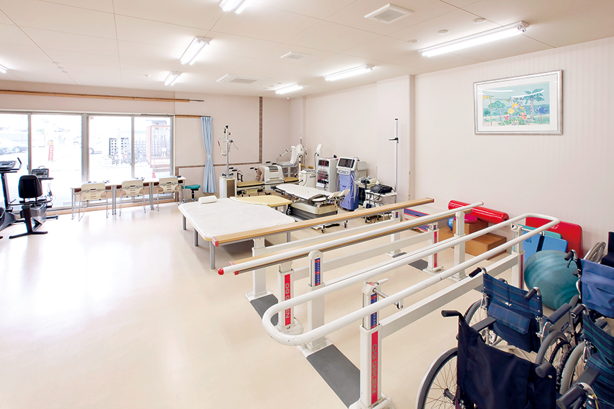 エルゴメーター、平行棒、平行支持台、訓練用階段や低周波、牽引、超音波、極超短波、レーザーの各治療器または各種車椅子、杖などを設置しています。病院、施設の機能訓練室とほぼ同じものが揃っています。