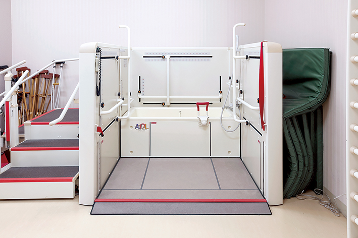 患者様の病気の状態やケガの種類、性別、体型などによって、使いやすい浴室や浴槽の形は異なります。この装置は、患者様が退院後に自宅で安全かつ自立して入浴できるように、リハビリテーションを行うためのものです。